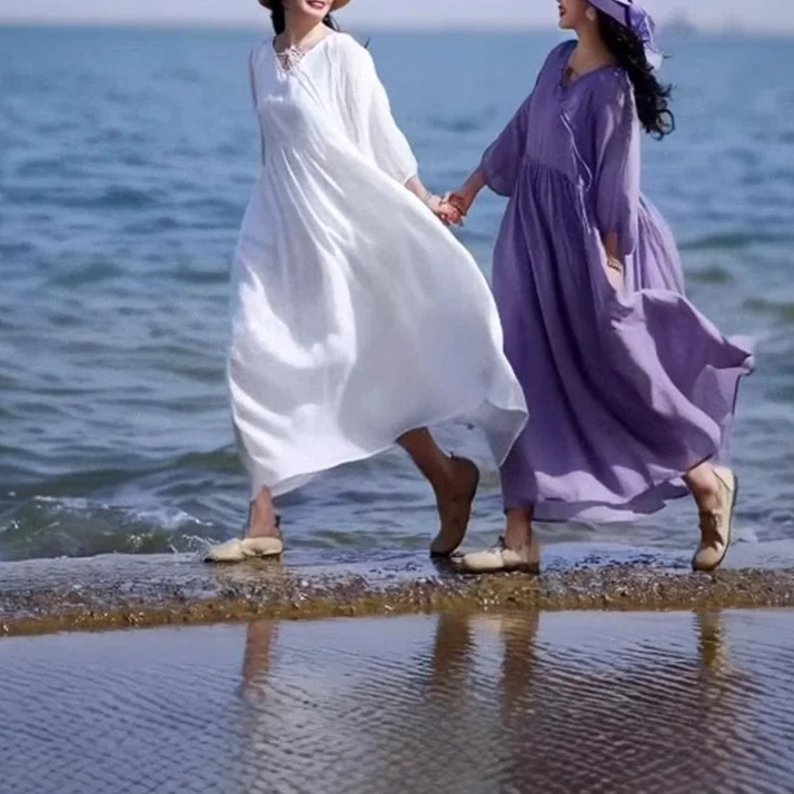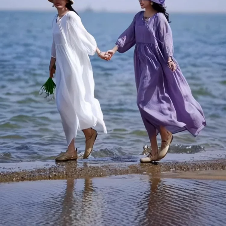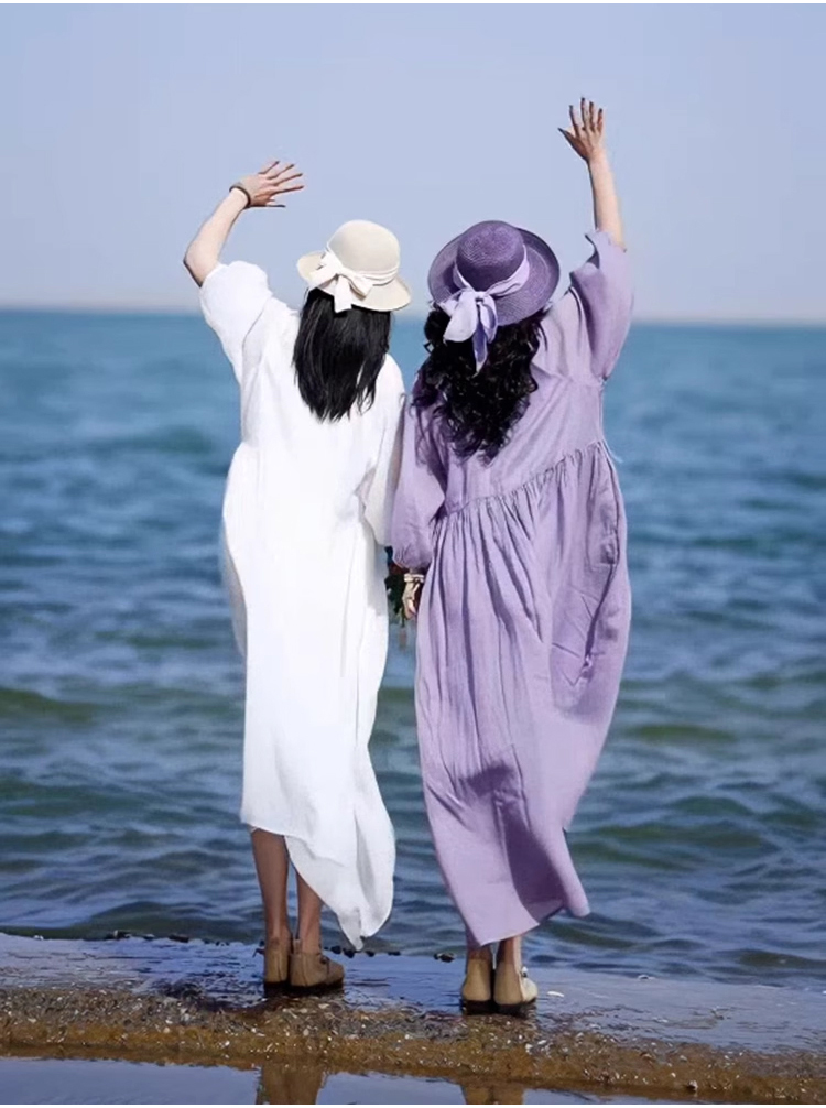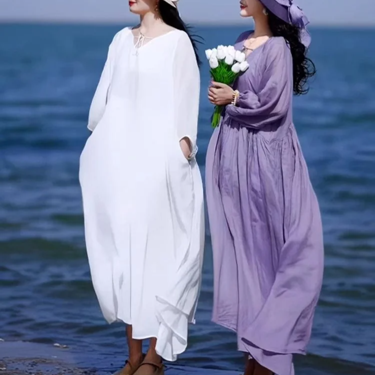 春夏向け長袖綿麻ワンピース